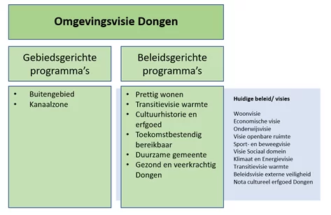 De gemeente heeft nu al een aantal visies/beleidsnota's die we in de systematiek van de Omgevingswet als programma kunnen zien. We geven deze lopende trajecten een plek. Daarnaast zijn er ook vastgestelde sectorale of thematische beleidsdocumenten (zoals de Onderwijsvisie en de Beleidsvisie externe veiligheid) die nog steeds actueel zijn. Deze sectorale (beleids)documenten worden onder de beleidsgerichte programma’s “gehangen”. Bij het opstellen van de integrale beleidsprogramma’s kunnen deze komen te vervallen.