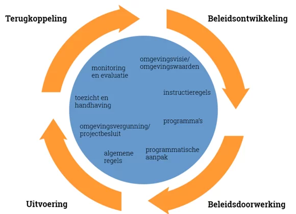 In de Omgevingswet staat de beleidscyclus centraal. Deze cyclus laat de samenhang tussen de omgevingsvisie en de andere instrumenten van de Omgevingswet zien. Het beschrijft hoe de overheid handelt in de fysieke leefomgeving. Daarnaast verbindt de beleidscyclus de instrumenten die de overheid daarvoor kan gebruiken logisch met elkaar.